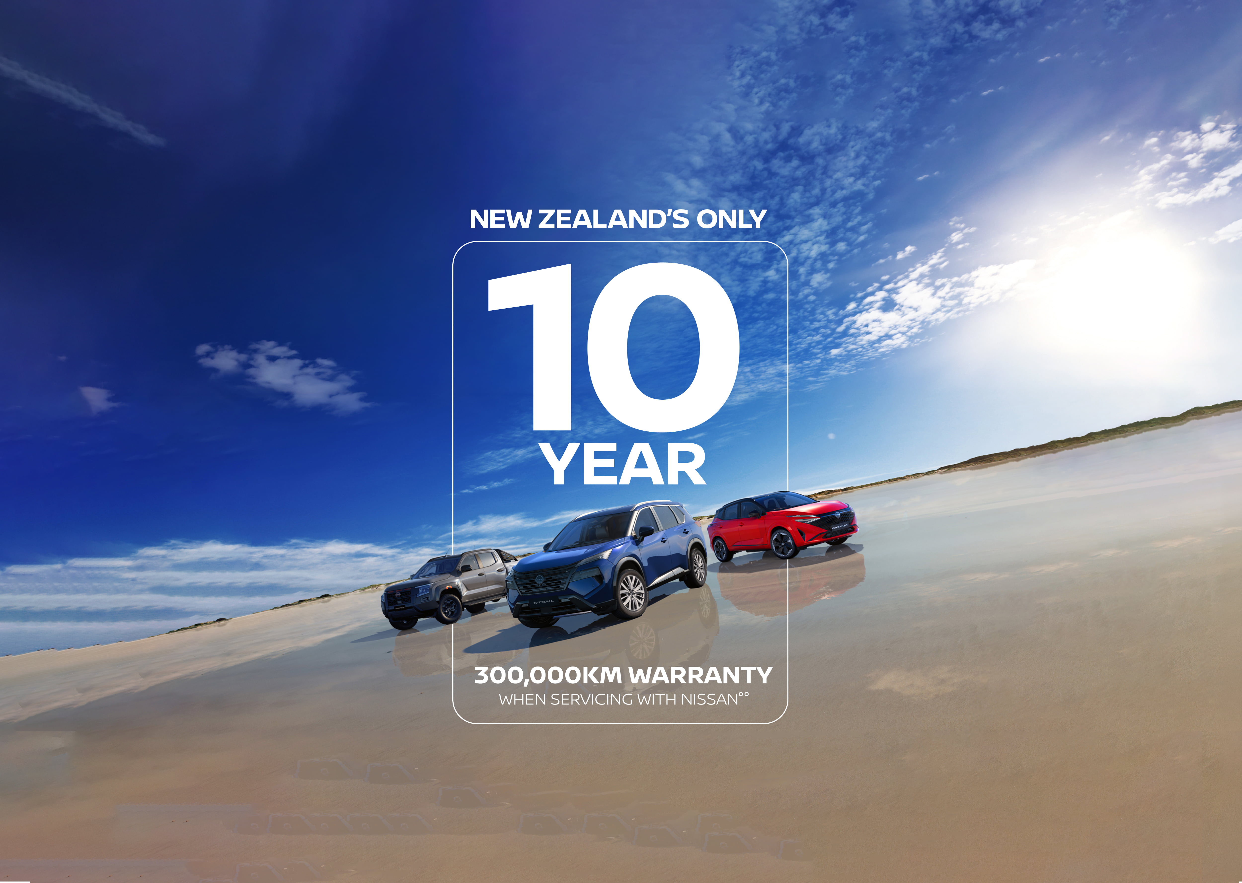 †When servicing at authorised Nissan dealers. Where vehicle is not serviced through Nissan or ceases to be serviced at Nissan, additional years will not be added, so 10 year/300,000km roadside assist (whichever occurs first) may not apply. Roadside assist duration will remain as 1 year unlimited kilometre roadside assist, plus any service activated years added under the Plan. Conditions apply. Full terms at http://www.nissan.co.nz/owners/roadside-assistance